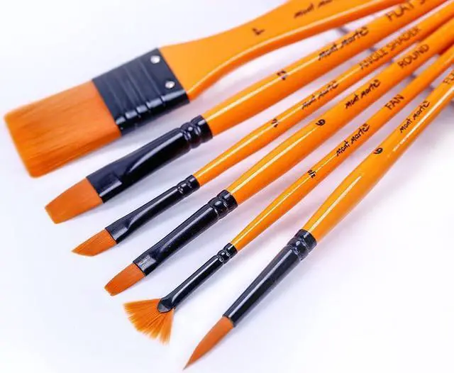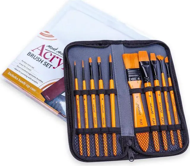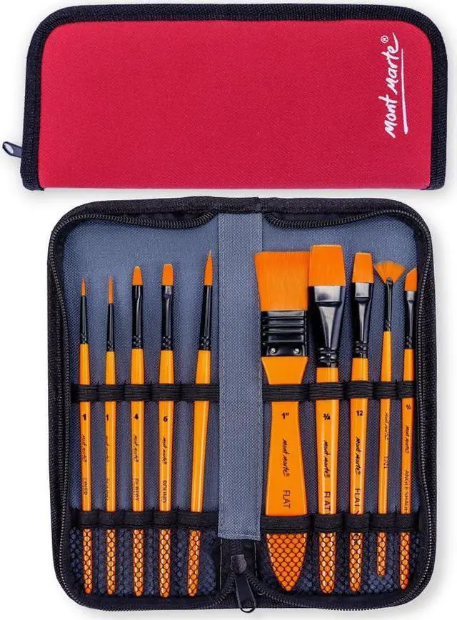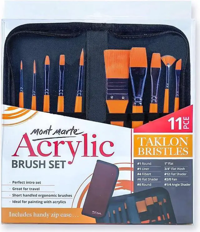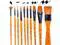 Includes 10 taklon paint brushes: Round #1, Liner #1, Filbert #4, Flat Shader #6, Round #6, Flat 1, Flat Wash 3/4, Flat Shader #12, Fan #2/0, Angle Shader #1/4