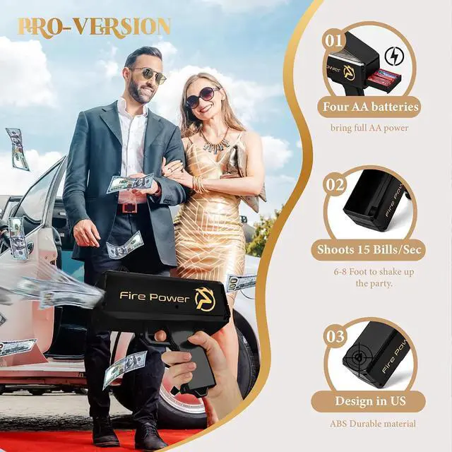 High-Speed Paper Blasting: Shoot fake paper money into the air at an impressive speed, creating a fun and dramatic visual effect for any event. Perfect for adding an extra element of excitement to parties, corporate events, and more.