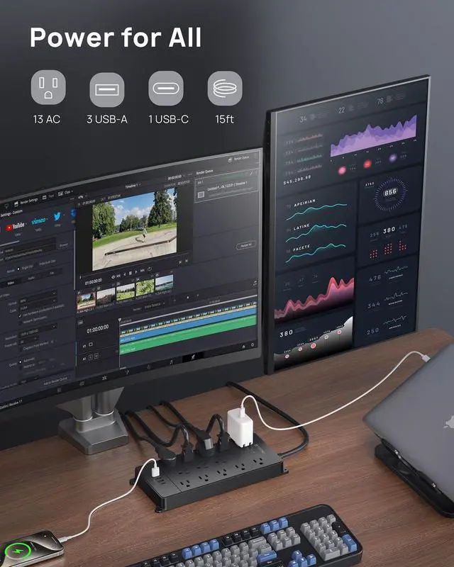 Power strip with 1 USB-C (15W Max) and 3 USB-A ports increases the charging efficiency for your USB devices. Enjoy the convenience of charging multiple smart devices simultaneously!