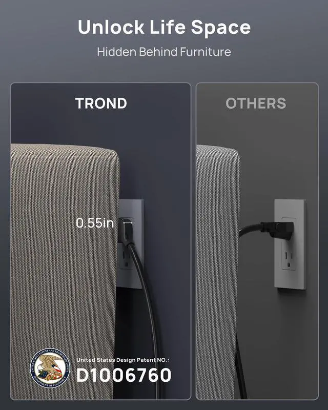 45° right angle low profile ultra flat plug allows you to place furniture close to the wall and keeps the bottom wall outlet clear for other use. Perfect for behind couch, cabinet, etc.