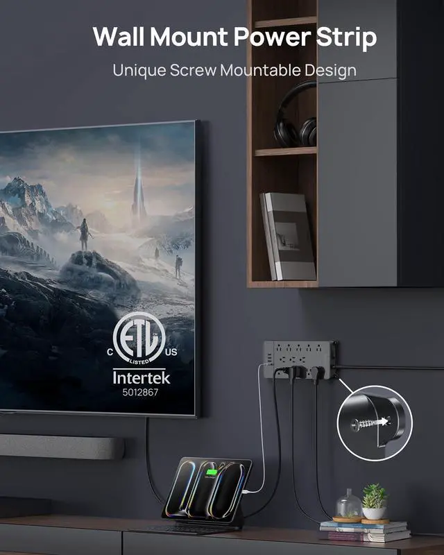 4 visible mounting ears on each corner and 4 screws allow to securely mount power strip with usb under desk or behind cabinet. So perfect pc gaming room accessories!