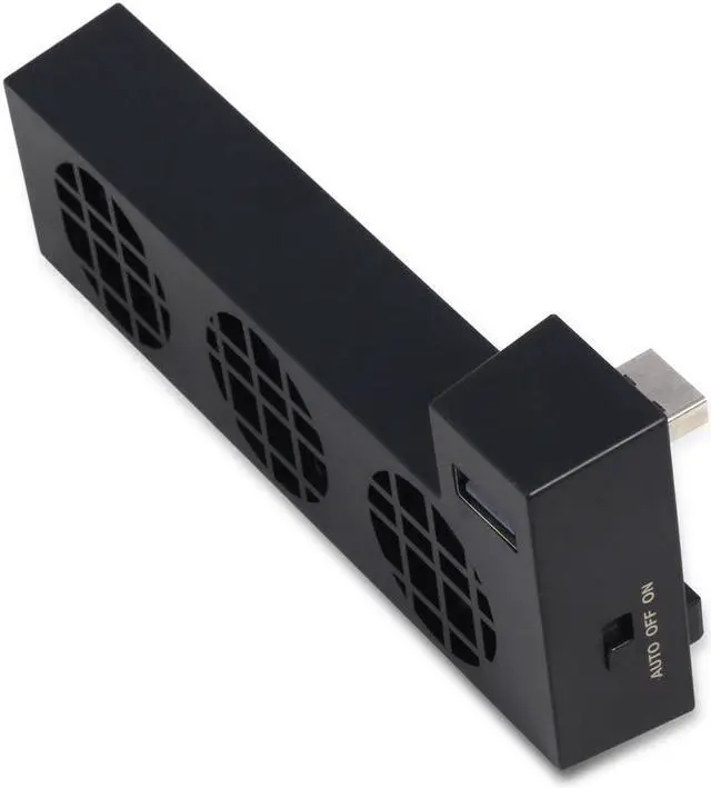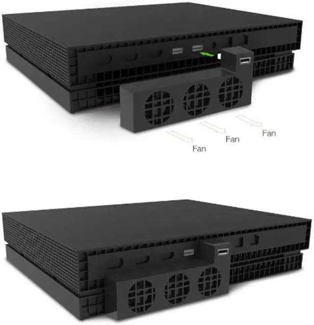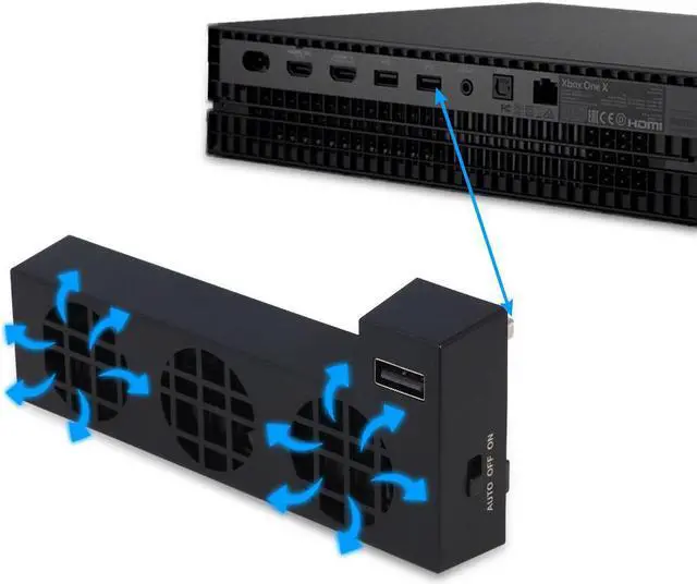 "ON": shut on, AUTO: work adjusts from temperature of your Xbox One X host, "OFF": shut off *One additional USB port for controller charging and USB disk and does not affect appearance *No more need to worry about your device overheating and burning your table from long hours of game play. *With 3 built-in high-speed fans to keep your Xbox One X console cool and calm, prolonging its lifetime.