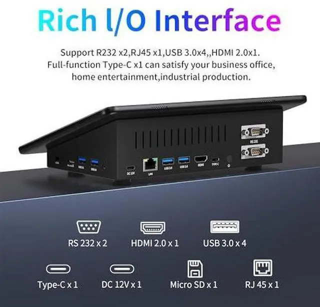 Rich input and output portsThe mini PC has many ports: 1x Type-C, 4x USB 3.0, 1x Ethernet port, 2x R232 port, 1x TF card, 1x HDMI output with 4K resolution. It supports remote wake up (Wake on LAN), PXE boot, auto power on and PSTN wake settings.