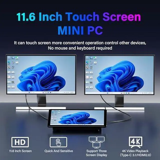 11.6 inch touch screen mini PC: the mini PC can be operated without a mouse and keyboard. This compact PC allows you to remotely control another laptop via the remote desktop protocol, making it a versatile device for use in a variety of environmentsincluding remote locations, educational institutions, and home automation systems.