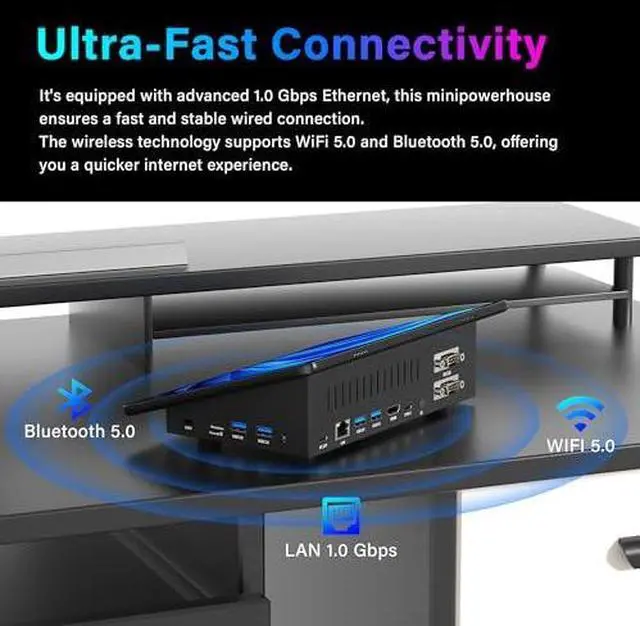 WiFi 5.0 & Bluetooth 5.0: This mini PC with WiFi 5.0 reaches a speed of 1300 Mbps. Gigabit Ethernet supports speeds of 10/100/1000Mbps, while Bluetooth 5.0 allows fast data transfer of up to 2Mbps, providing a different web browsing, log reading, text editing and email experience.
