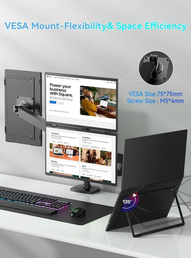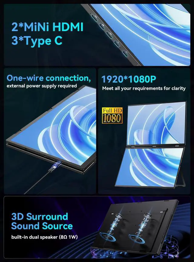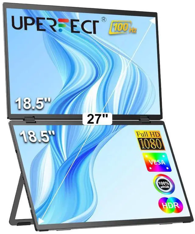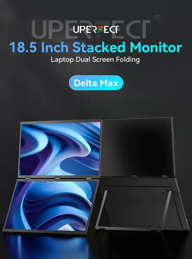 User-friendly-DesignBuilt-in Adjustable StandThe adjustable stand and the foldable dual-screen design are ergonomic and work together to adjust the display angle. Two screens stacked from top to bottom, aid in users scrolling less, while reducing the
