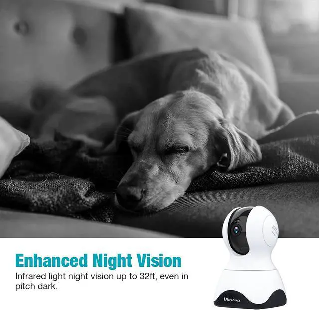 Security camera, Night Vision with a night vision up to 32 ft, auto-switching to night mode when the light is dimmed, helping you see up to 32 feet at night.