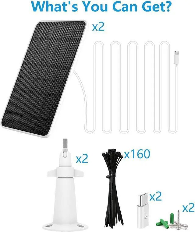 Package Included-The solar panel kits are made of high-quality and environmentally friendly materials, including 2 solar panels with 3M cable with Micro USB port each, 2*Type-C port connectors, 2*360 degree mounting brackets, 6*screws, 160*cable tie. Please note that the charging efficiency depends on the intensity of the sun's rays and the speed at which the outdoor cameras consume power. If you have any questions, feel free to contact us, your satisfaction is always our aim.