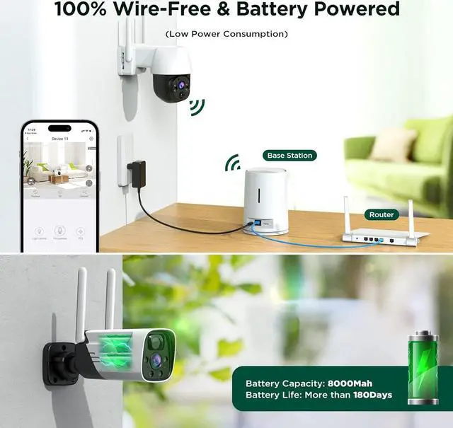 100% WIRE-FREE+ RECHARGEABLE BATTERY POWERED Each camera is powered by an 8000 rechargeable battery, combined with low power consumption tech, which can last for 6 months (180-days) on one charge. No wires are required for installation, flexible to install wireless security cameras anywhere. The sliding base only takes one minute to take down the camera and recharge it.