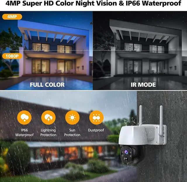 4MP FULL HD COLOR NIGHT VISION +5× ZOOM With 2 infrared+white LEDs, 4mm lens, and IR-CUT tech, the wireless battery camera outdoor captures 4MP (2560×1440P) full-color sharp images within 65 Feet of a 120° wide view even at night. 5× Digital Zoom features of PTZ battery power security cameras allow you zoom in to get every detail more easily and clearly.