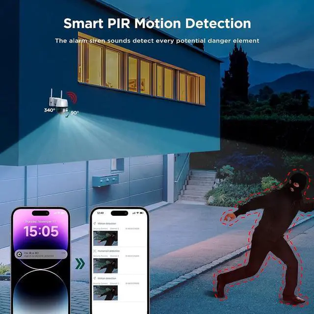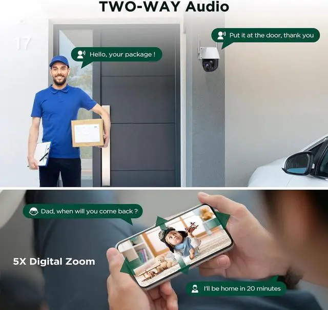 SMART PIR MOTION DETECTION + TWO-WAY AUDIO Equipped with an advanced PIR sensor, the battery security cameras accurately capture moving humans or pets only. When motion is detected, it will send you real-time alerts via the APP. Built-in speaker and microphone, you can talk with people remotely or drive out the suspicious around your house.