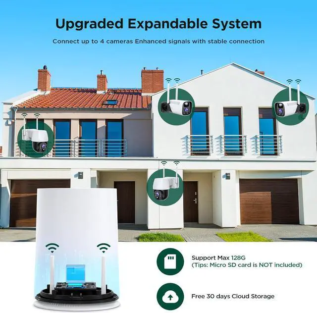 PTZ + BULLET CAMERA + IP66 WEATHERPROOF Adopts with 355° horizontal, 90° vertical PTZ camera, and 120° wide-angle Bullet Camera, the battery powered wireless security camera system covers every corner no blind zone. 5DB antenna enables a strong stable wireless connection in wider areas and IP66 waterproof allows cameras to work well on snow, rainy or sunny days.