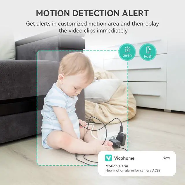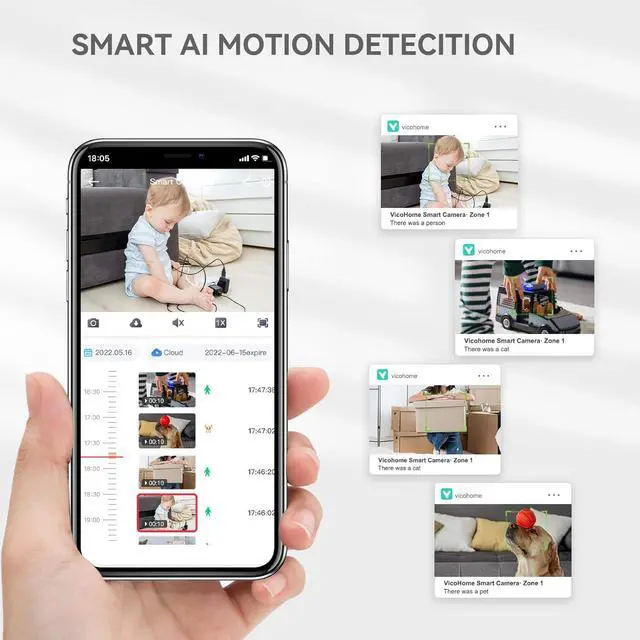Advanced AI Human Pet Vehicle Recognition & PIR Motion DetectionThis indoor Security Camera With AI technology, analyzes and distinguishes humans, pets, and vehicles based on the monitoring target you set in Vicohome App. Data is processed via AI, resulting in faster decision-making and fewer external errors. The end result is more accurate detection and fewer false alerts. You can distinguish cute babies and pets more clearly