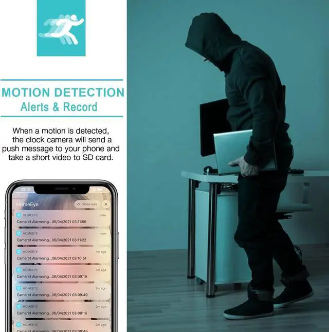Motion Detection Alarm and RecordThe app will send push alerts to your phone once a motion is detected. This mini camera will also take photos to app. If you enable motion detection record on SD Card, it will auto take a short video to SD card once the motion is activated.
