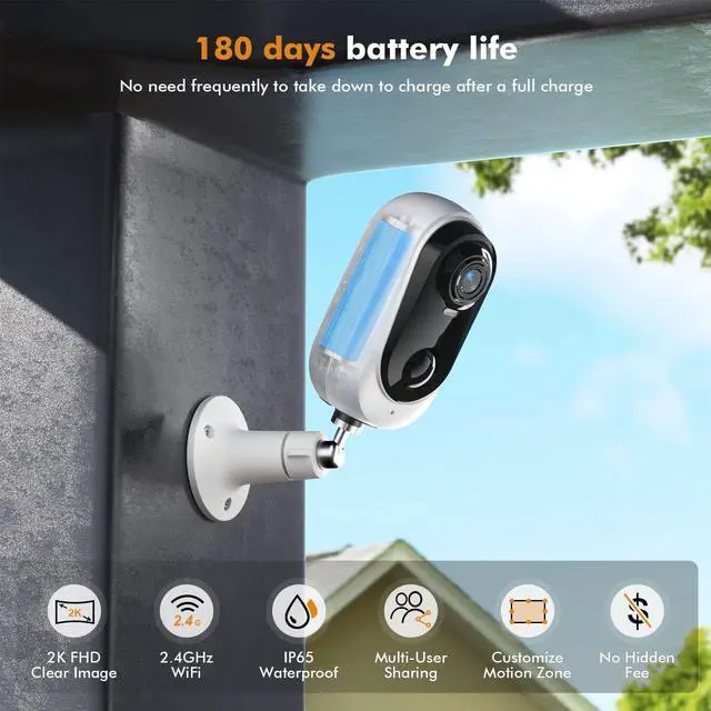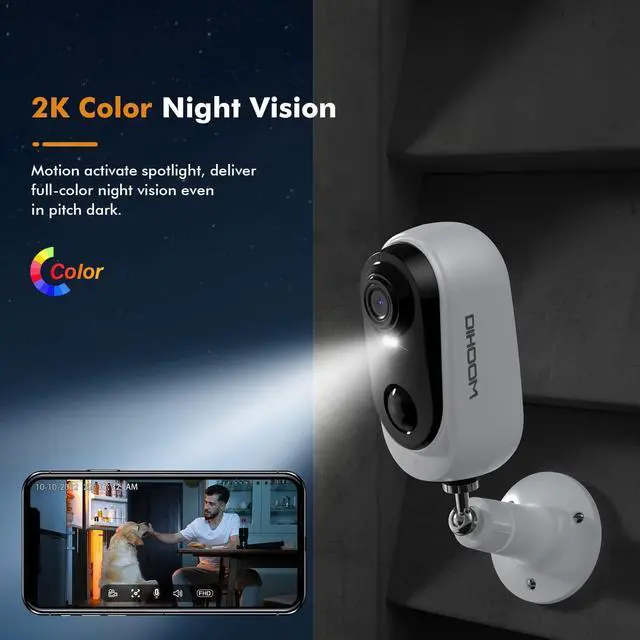 2K Live View and Color Night VisionBattery security camera advanced optic lens and equipped with 2K resolution and 3 MP pixels to provide with clear images and videos. Clearly monitoring your property and reduce blind area, support manually magnify picture to help see clear details. The home surveillance camera supports full color night vision, when motion is detected at night the camera automatically turns on the warm light to capture color images or video.