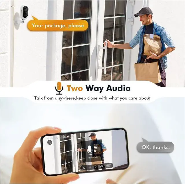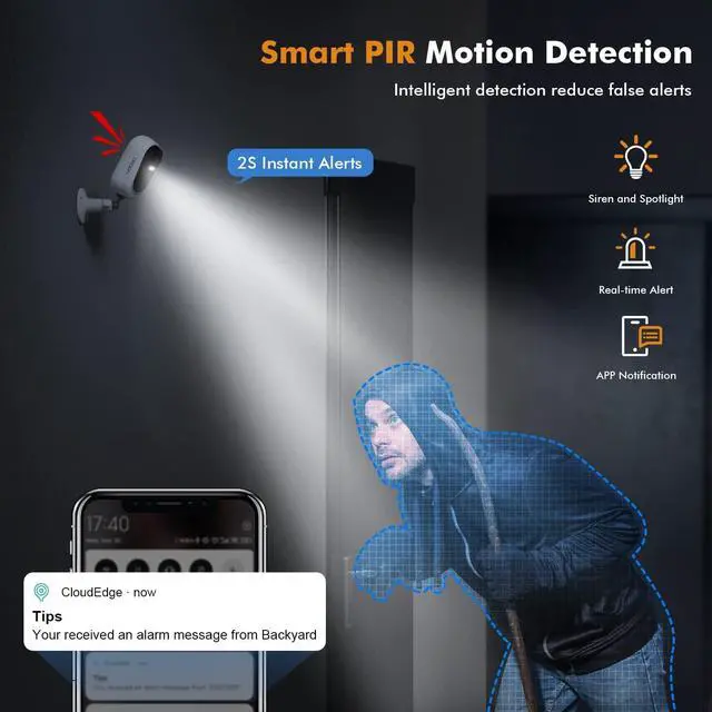 Real-time Alerts & 2-way AudioWireless camera is configured with smart PIR sensors that analyze humanoid and motion detection, when movements detected send instant notifications to your phone. very quickly react help to catch up with what's going on. you can setup to attempt recording only human motions to reduce annoys false alarms. The home ip camera manually siren feature helps you threaten off the intruders, the camera fluently 2-way audio allows you talk to camera scenes from anywhere.