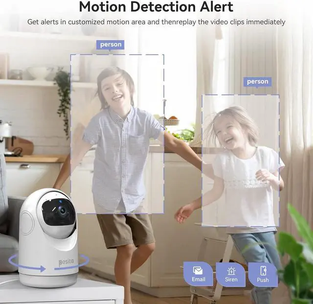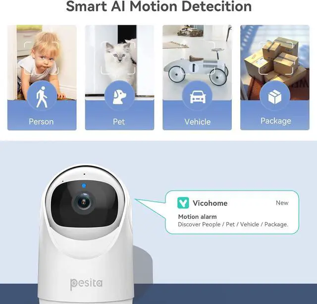 1080P FHD for 360 Degree Full View&Motion Detection Tracking 1080P Full HD indoor security camera with pan, tilt and zoom (PTZ) function via vicohome App, This pet camera with app will detect and tracking the moving object, and motion alerts will be sent to your phone to keep you informed of every potential danger at your home.