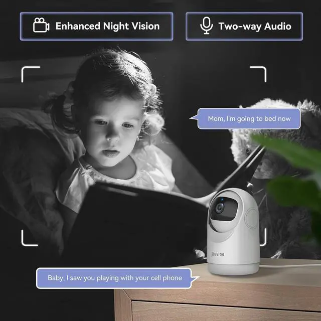 2-Way Audio & Super Night VisionThe indoor wifi camera built-in noise filter technology two-way conversation. You can stay connected with your beloved ones from anywhere at any time. This baby monitor camera equipped with 8*850nm infrared LEDs, auto-switching to night vision mode when the environment is dimmed. Perfect for baby, elder, pet, nanny monitor