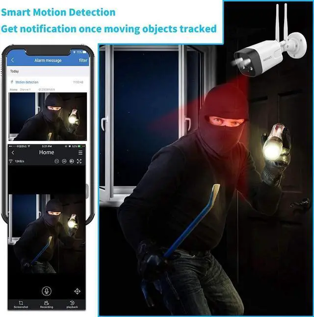 {AI Detection} With the help of advanced recognition algorithms, OOSSXX will send notifications in real time once abnormal actions.Compared with the traditonal PIR or detection, AI Human Detection can avoid 99% False Alarm by leaves, cloud, animals or insects (This feature can be manually turned on/off).
