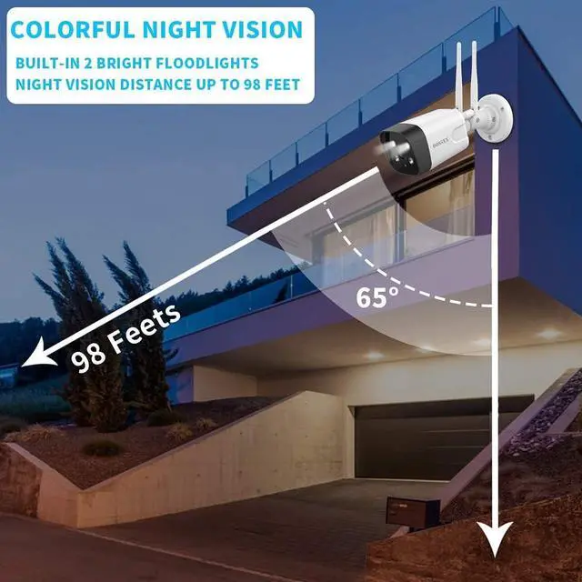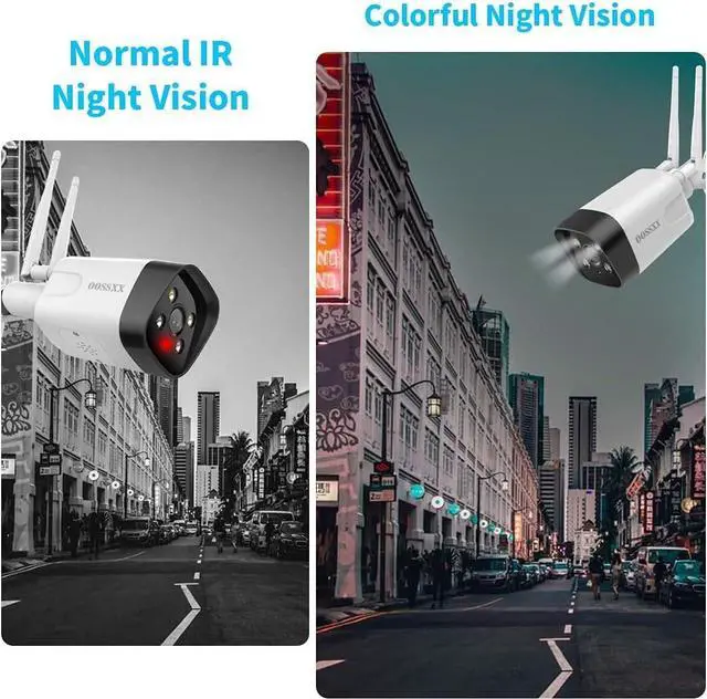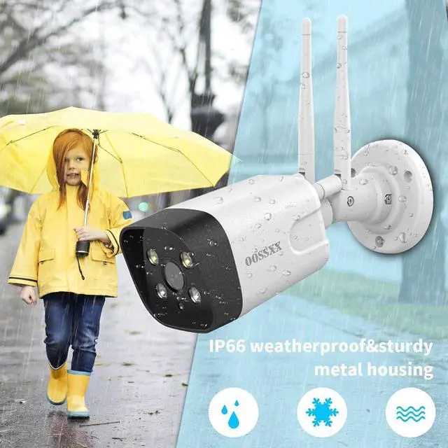 {Dual antenna and Waterproof} A stronger WiFi dual antenna connection allow OOSSXX outdoor security camera to have a more stable connection, professional IP66 weatherproof camera housing allows this outdoor WiFi camera working well in any weather status. {AI Detection} With the help of advanced recognition algorithms, OOSSXX will send notifications in real time once abnormal actions. Compared with the traditonal PIR or detection, AI Human Detection can avoid 99% False Alarm by leaves, cloud, animals or insects (This feature can be manually turned on/off). {2K 3.0MP and Great Night Vision} The security camera ensures the safety of people and homes for 24/7 hours. Everything within 50 feet can be seen even at night. It is equipped with an IR-LED system. It automatically activates the infrared mode in low lighting conditions. {Two-way Audio&Family Sharing} You can keep in touch with your family when you miss them and want to talk to them anywhere and anytime. This security camera supports multiple users (up to 4) to view streaming video simultaneously. You can remotely live view or chat by high-quality two-way audio via APP. Just download the free Eseecloud APP from APP Store (IOS) or Playstore (Android) on smart-phone.