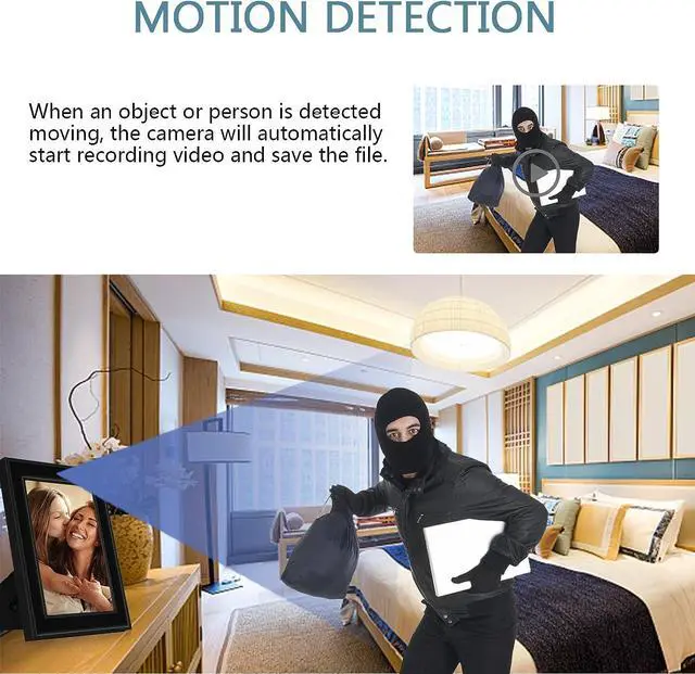 Motion DetectionWhat does the photo frame hidden camera do when someone walks past the camera? It will detect someones movement and automatically start recording video and save the data. Then you can view these videos. It will become your guard, escorting your home, property or personal safety.