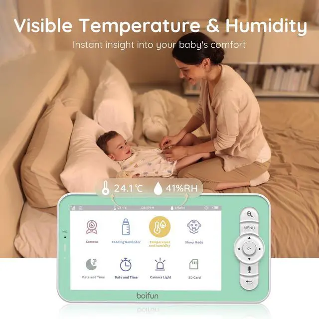 2K WiFi Baby Monitor with Camera and Audio,Smartphone APP, Colorful Night Light, Smart AI Motion & Sound & Humidity & Temperature Detection, Auto Tracking,5-Inch Monitor Control, Night Vision
