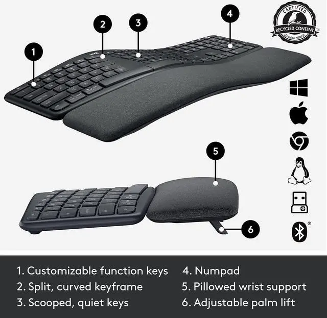 Improved typing posture: Type more naturally with a curved split KeyFrame. The sloping keyboard reduces strain on your wrists and forearms.