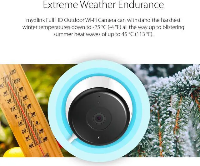 Built for Extreme Canadian Weather - Certified IP65 weatherproof camera housing for indoor or outdoor installation ^^ High Definition Resolution and Visibility - Full HD 1080p video resolution gives you crisp, clear and detailed live and recorded video ^^ Stream and Cast - Watch live video streaming on Echo Spot or on Google Chromecast. Works with both Alexa and Google Assistant. ^^ Talk through your camera - Have real-time two-way conversations with people at home or just tell the dog to get out of the garden with two-way audio ^^ Recording Options - Choose where to record with options of free and paid cloud recording to your private account or microSD card which can be viewed on the mydlink app.