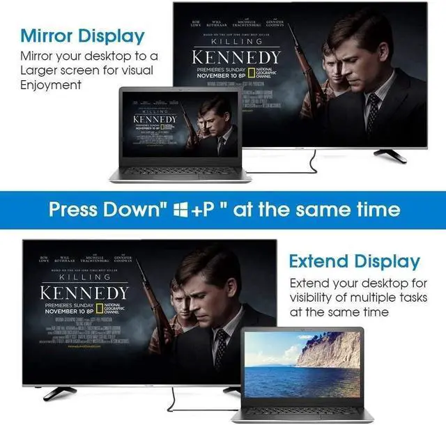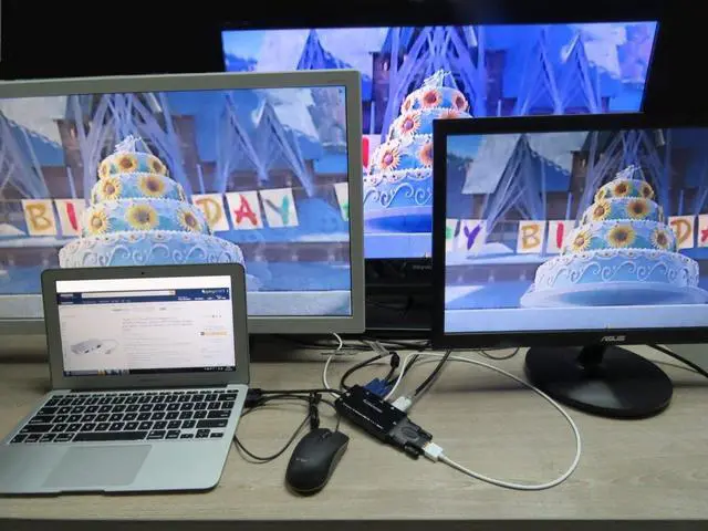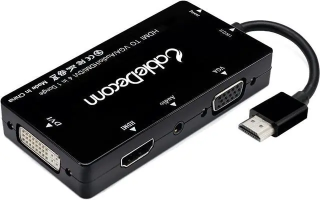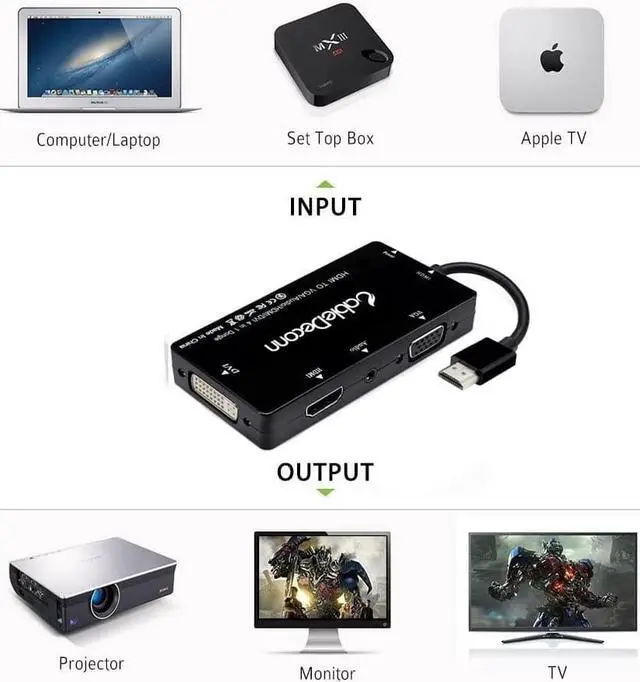 Lightweight and portable adapter allows you to display content on your HDTV, monitor, computer, tablet, projector and other devices with HDMI or DVI or VGA to HDMI connector. Note: This adapter that you can only connect one monitor at a time, A separated HDMI/DVI/VGA cable is required