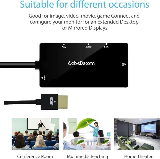 Multifunction HDMI splitter converter cable with audio output, supports HDMI/DVI/vagal(sold separately) output simultaneously to enjoy your favorite movies, YouTube clips, iTunes songs and movies