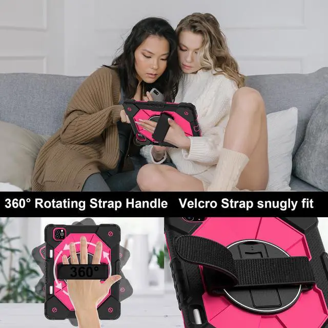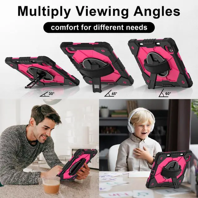 Built-in 360 Rotatable Kickstand + Hand Strap : 360-degree rotating swivel stand supports position of 3 angles(Vertical, Horizontal, and Halfway between), ideal for watching videos, conferences and travelling. Soft rotating handle strap prevents falling of tablet, featuring convenient use for school teachers, students, waiters, doctors, nurses and conference presenters.
