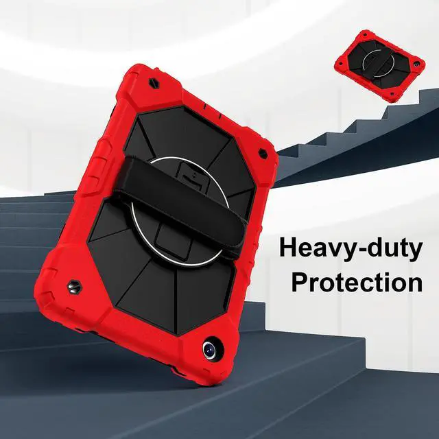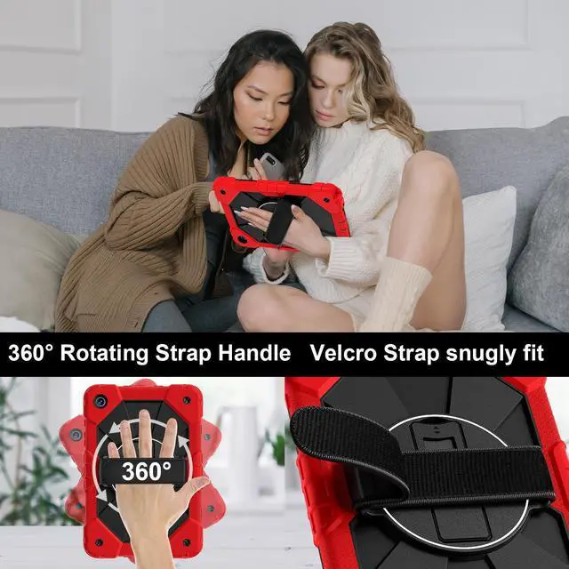 Built-in 360 Rotatable Kickstand + Hand Strap : 360-degree rotating swivel stand supports position of 3 angles(Vertical, Horizontal, and Halfway between), ideal for watching videos, conferences and travelling. Soft rotating handle strap prevents falling of tablet, featuring convenient use for school teachers, students, waiters, doctors, nurses and conference presenters.