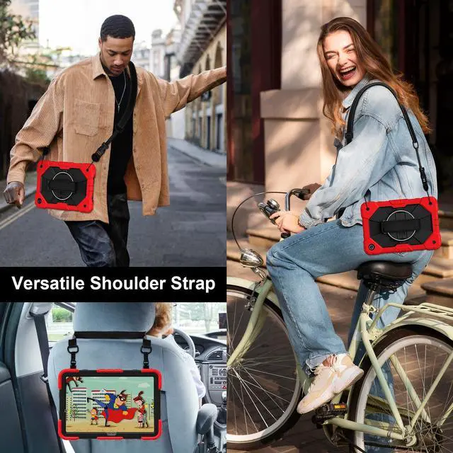 Adjustable Shoulder Strap : Adjustable shoulder grip can be slanted and release your hands completely. This function is perfect for traveling, restaurant ordering, home product introduction, engineer outdoor operation, scene of industrial construction,teacher, etc. Also, the strap allows you to hang up your tablet behind car seat for entertainment for kids.