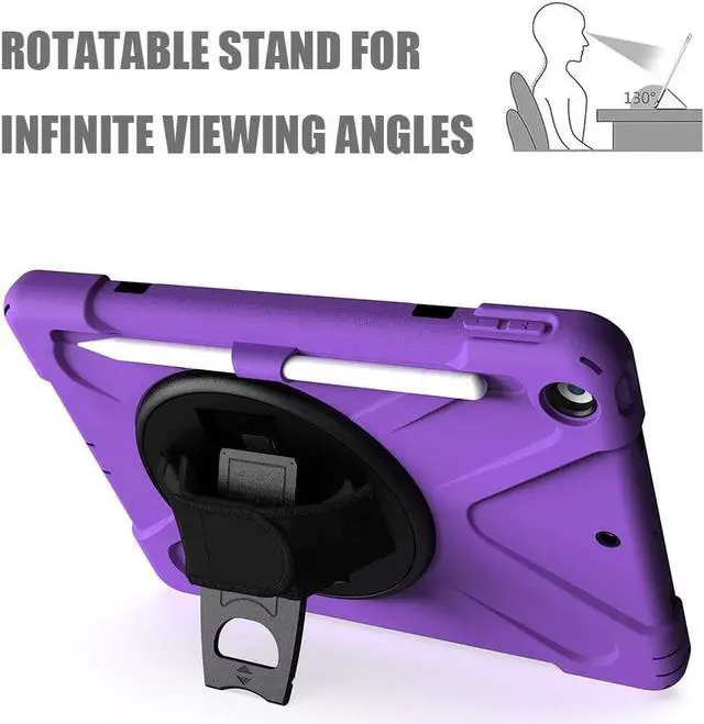 FEATURES: Built-in Kickstand is 360 degree rotating, you can adjust your 10.2 inch iPad to whatever angle you want, perfect for watching videos and chatting; Built-in elastic Pencil Holder makes it easy to pull out and store your Apple pencil store your Apple Pencil Adjustable velcor hand strap allows big hand and small hand, perfect for kids and adults. Adjustable and detachable Shoulder belt is very convenience, safe and fashion you can carry tablet with should belt wherever you want