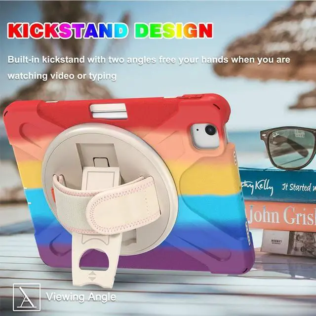 FEATURES: Built-in Kickstand is 360 degree rotating, you can adjust your New iPad to whatever angle you want, perfect for watching videos and chatting; Built-in elastic Pencil Holder makes it easy to pull out and store your Apple pencil store your Apple Pencil Adjustable velcor hand strap allows big hand and small hand, perfect for kids and adults. Adjustable and detachable Shoulder belt is very convenience, safe and fashion you can carry tablet with should belt wherever you want