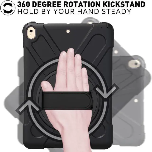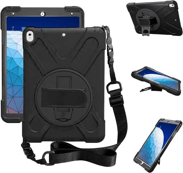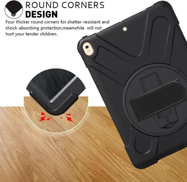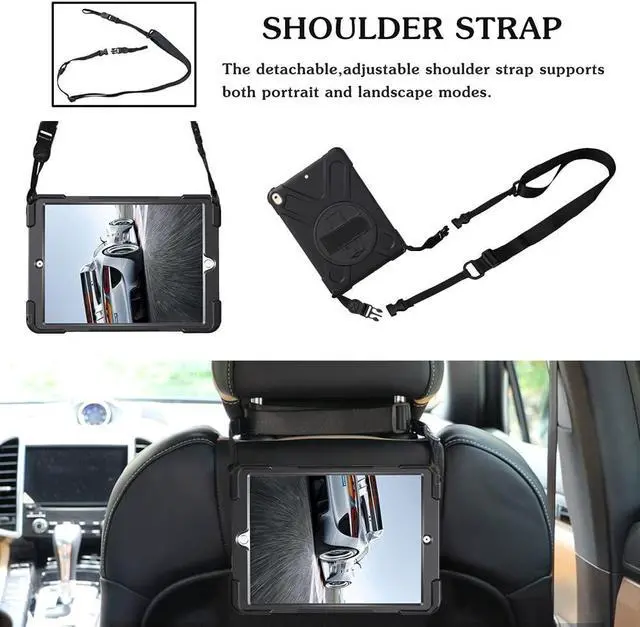 FEATURES--This iPad pro 10.5 case connected with 360° turntable built-in kickstand, you can adjust angles, perfect for watching videos and chatting. Adjustable hand strap allows big hand and small hand, perfect for kids and adults to use iPad 10.5 inch tablet during work, study or journey, ideal for students ,teachers, engineers, cashiers and waiters, etc Adjustable and detachable Shoulder belt allows carry the tablet on neck or shoulder like a bag and sling it on car head rest