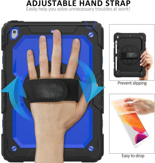 360° Rotatable Hand Strap & Shoulder Strap & Rotating Kickstand: The adjustable hand strap helps you hold your iPad 9th/8th/7th gen easily, it is just as a grip with soft and comfortable feelings. You can get landscape view or vertical view as you want. And you could carry your iPad 10.2'' anywhere convenience with the shoulder strap. The length of the shoulder strap can be adjusted to fit adults or kids. With the rotating kickstand, you could get the watching angle and typing angle as you want.