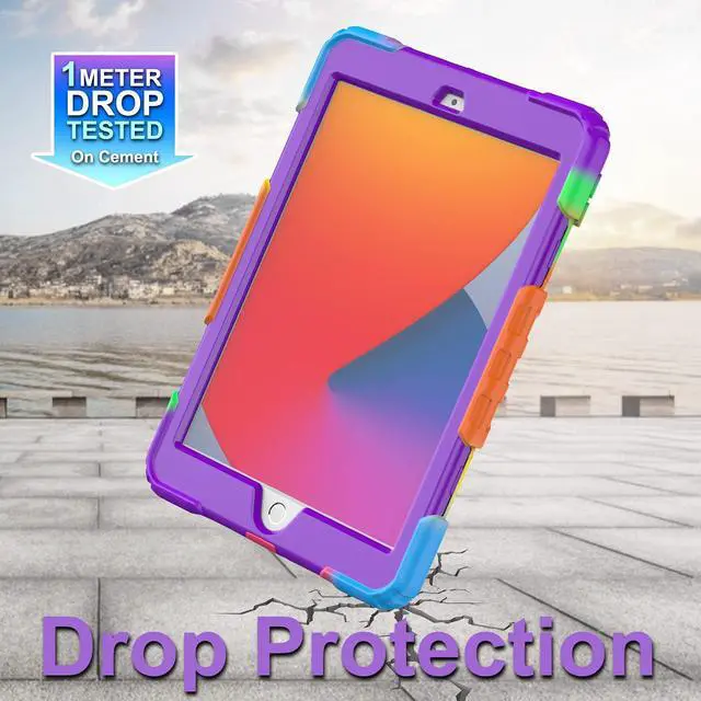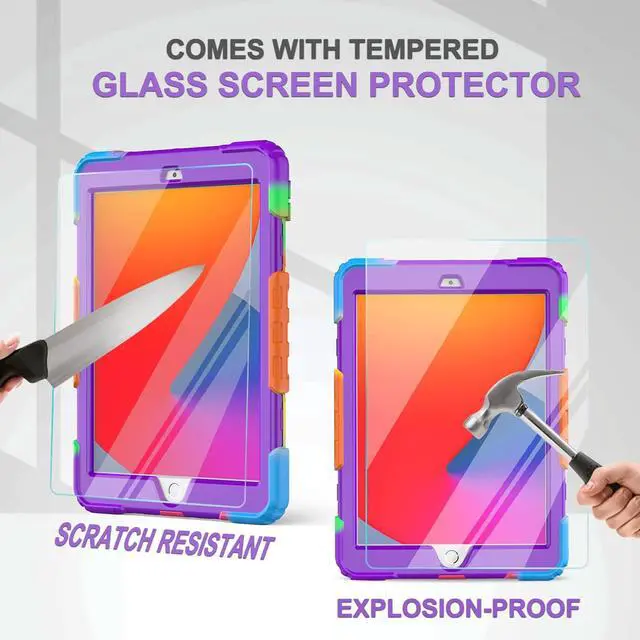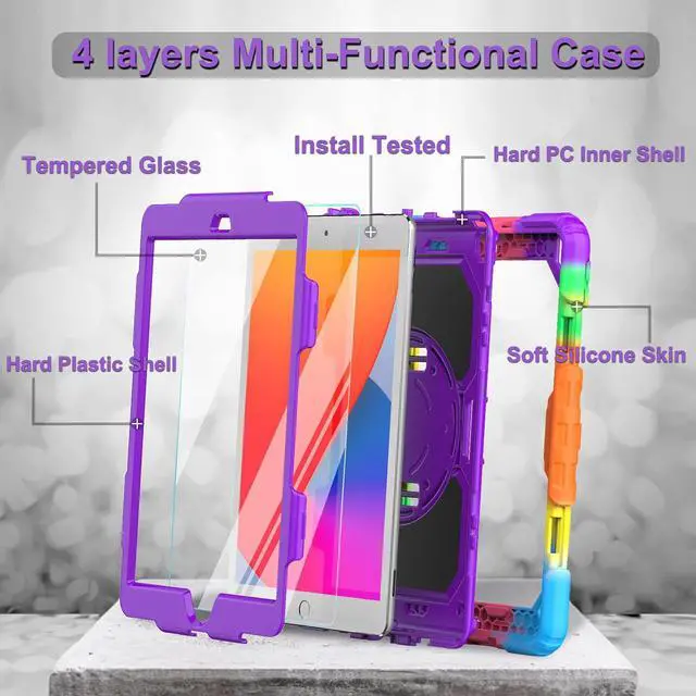 4 Layer Durable Protection: Flexible outer silicone & hard PC inner shell & tempered glass & top PC frame provide the max protection for your iPad 9th/8th/7th generation 2021/2020/2019. The outer silicone is quite thick and soft, it can absorb the impact from accident drop or shock. Totally kid/toddler proof product for your iPad 10.2 inch.