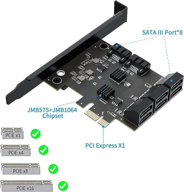 80TB Expansion: 8 Ports SATA 3.0 interfaces can expand to 80 TB, provide a high-volume database for your workstation and computer equipment. With using The chip JMB575+JMB1064 Chipset, improve this card more stable and compatible