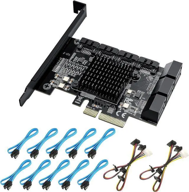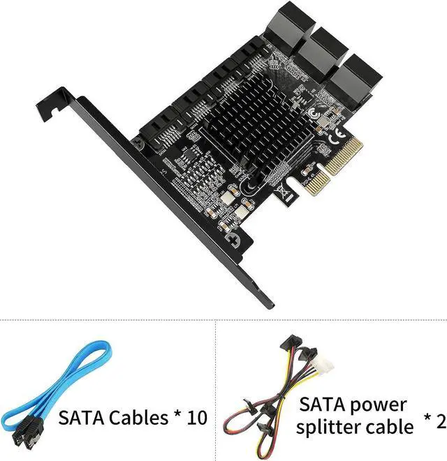 What You Get : 1 x PCIe to SATA 3.0 10-port controller card, 10 x SATA cable, 2 x SATA power splitter cable, 1 x user manual