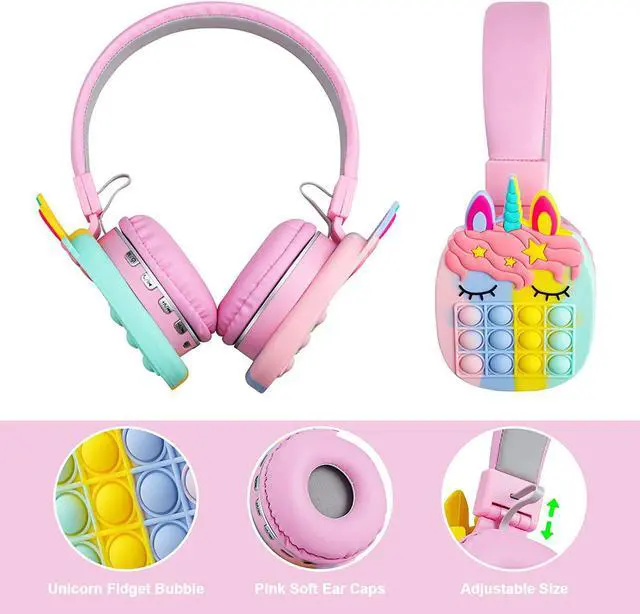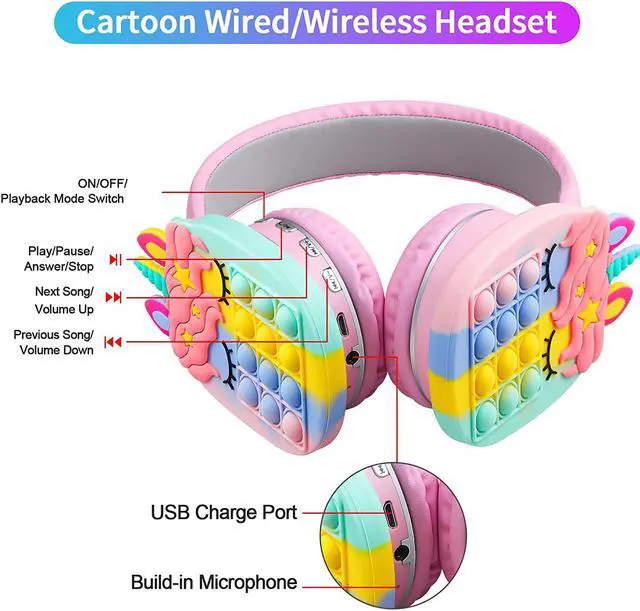Cute Cartoon Adjustable Headset with 3 ModelsAdjustable headband and foldable bluetooth headphones design, easy to carry, suitable for sports, running or traveling. Contrast color is personalized and unique for eyes catching. The bubbles on the side of the headset brings joy to every children and adds fun to your daily life. Short press the button M can switch the 3 play modes (Bluetooth model/ TF Card mode/ Radio Mode).