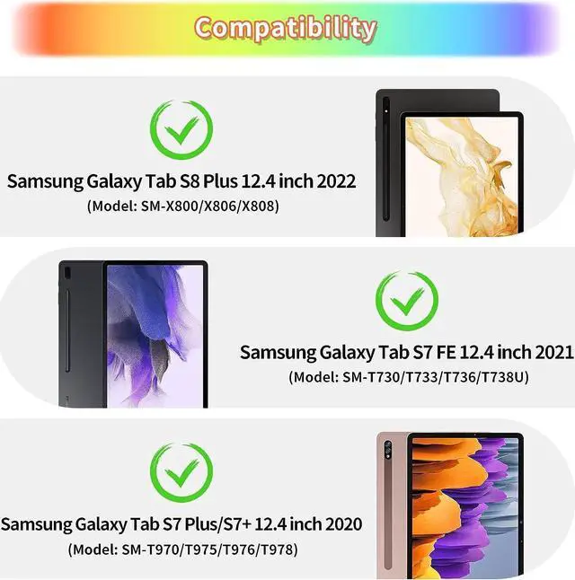 Compatible ModelDesigned for Samsung Galaxy Tab S7 FE 2021 (Model: SM-T730/T733/T736/T738), Tab S8 Plus 2022 (Model: SM-X800/X806), Tab S7 Plus 2020 (Model: SM-T970/T975/T976/T978). Please confirm your tablet model before you order this case. This product includes 1x tablet case, 1x shoulder strap, 1x screen protector and 1x keychain.