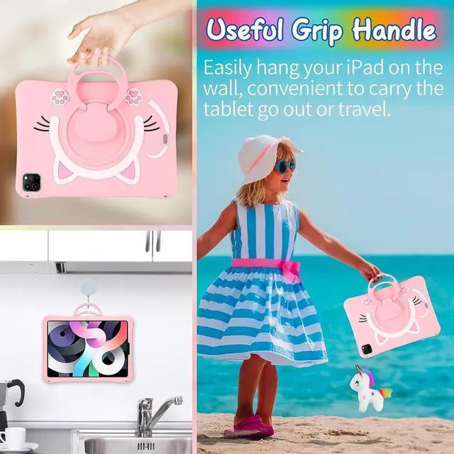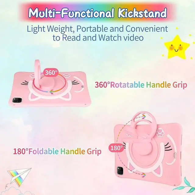 360 °Rotatable & 180° Foldable Handle KickstandThe mutil-functional kickstand design is useful which can be used as horizontal and vertical stand makes you more convenient to read , browse website, watch movies or face video with friends, also come with handle and cute key chian which will convenient to carry-on ipad.