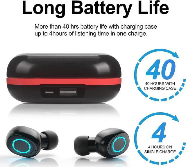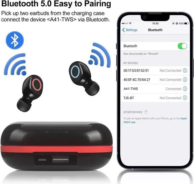 Bluetooth 5.0 & One Step ParingThis wireless earbuds adopts the most advanced bluetooth 5.0 version that supports connect to various devices with bluetooth like smartphones, tablet, PC, compatible with iphone samsung and android. Only need one step pairing, pick up 2 earbuds, enter mobile phones Bluetooth setting and choose "A41-TWS" to pair the earbuds, features auto reconnection.