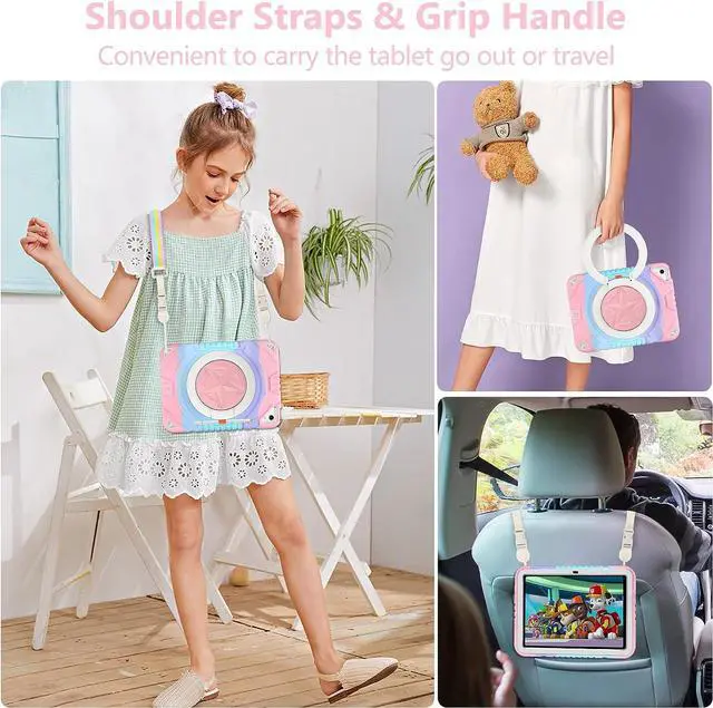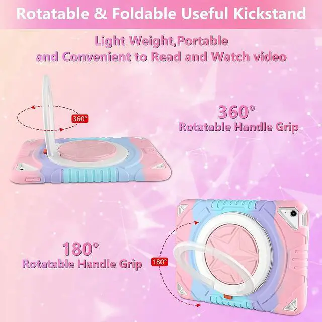 360 °Rotating & 180° Foldablet Handle KickstandThe mutil-functional kickstand design is useful which can be used as horizontal and vertical stand, more convenient to read, type or watch video. The 180° foldable handle design supports hanging the tablet on the hook or carrying it for go out.