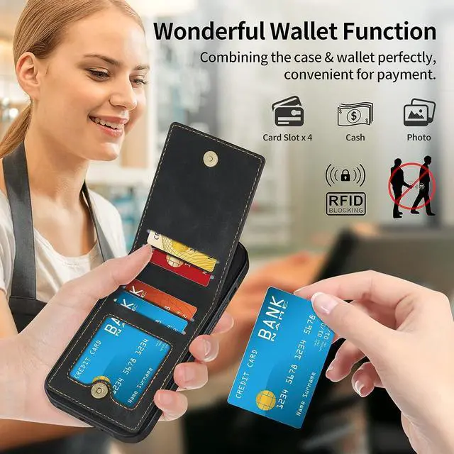 Card Holder Wallet Case 4 card slots meets most needs of daily life such as insert id card/credit card/debit card/driving license or a few cash at the same time. RFID blocking design can block RFID signals to protect your card information.