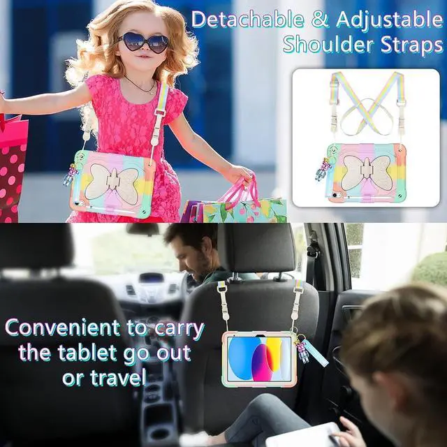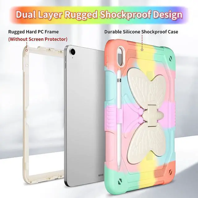 Butterfly Kickstand/ Lanyard/ KeychainBuilt-in sturdy butterfly kickstand is useful which can be used as horizontal stand makes you more convenient to read, type, browse website, watch movies or face video with friends. This ipad 10th gen case also come with lanyard and cute key chian which will convenient to carry-on ipad.