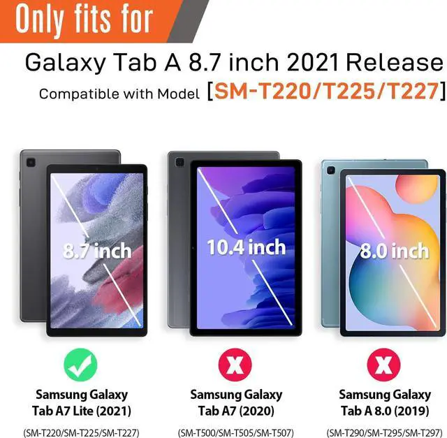 CompatibilityThis case ONLY compatible with Samsung Galaxy Tab A7 Lite 8.7 Inch 2021 Released (Model:SM-T220/T225/T227). NOT compatible with other tablet models. Please confirm the model before purchase. Go to "Settings" > "About" > "Model Number", you'll see the model number: SM-T220 or SM-T225 or SM-T227.