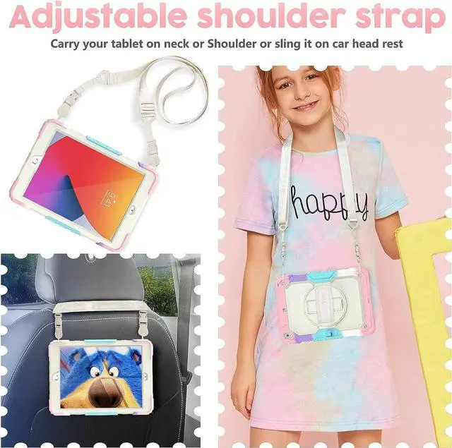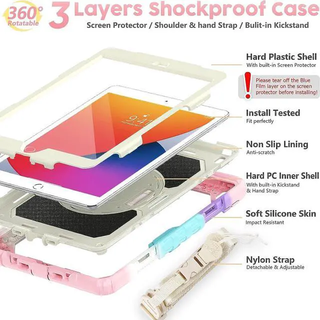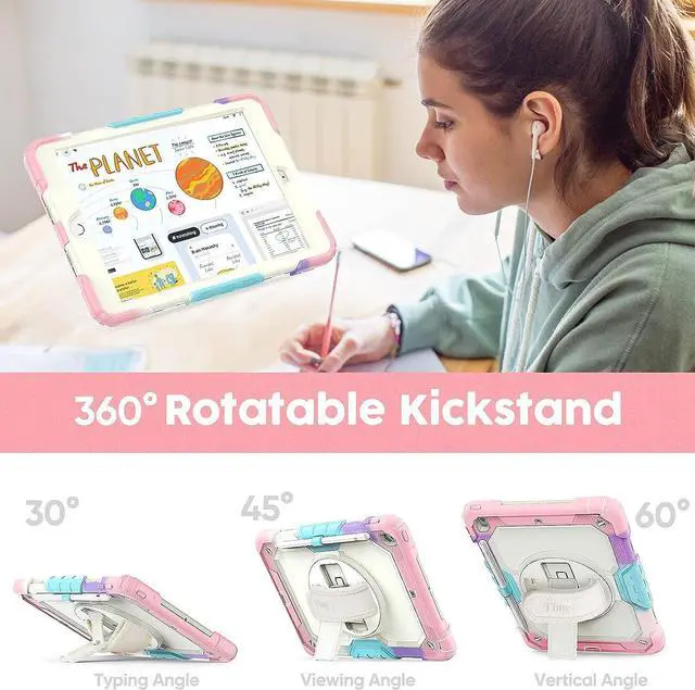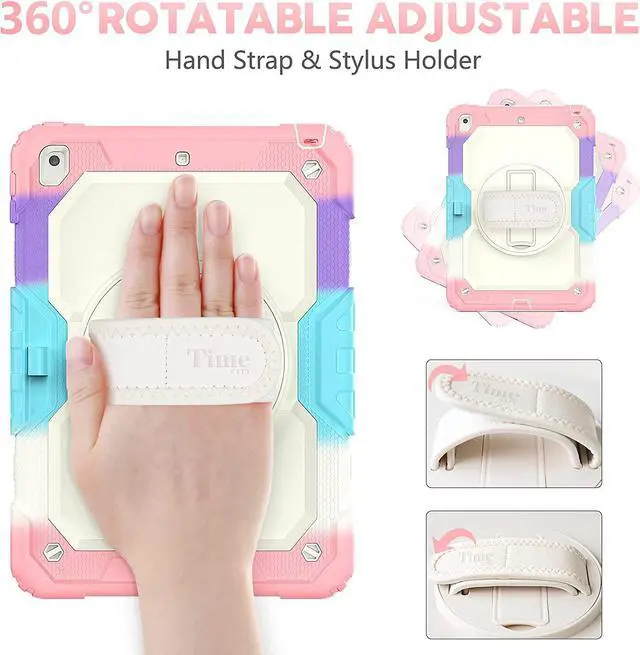 Stand + Shoulder Strap \u2014 The gorgeous 10.2-inch Retina display is an amazing way to watch movies or draw your next masterpiece. However, it also needs a free display angle. This case provides a bracket that can rotate 360 stand and adjustable length shoulder strap. The stand can provide multi -angle support. The shoulder strap can hang your iPad somewhere.
