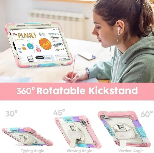 [360 Degree Swivel Kickstand] The back cover with built-in a 360 degree rotatable turntable, a folding kickstand is hidden inside. When the kickstand is extended, it can be rotated 360 degrees with the turntable to achieve different stand angles. This case comes with pencil holder function. This case supports Pencil 2 wireless charging.